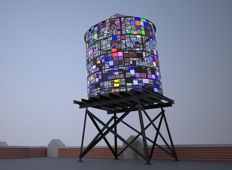 Artist Tom Fruin has installed several stained-glass water towers over the years for his ICON series. The project uses materials that have been scavenged, reclaimed, or recycled and constructs them into sculptural tributes to architectural icons around the world. Now, the artist is back again with a new installation in Brooklyn Heights, at the Brooklyn Bridge Park. You can check out the installation on the rooftop of 334 Furman Street, very visible from the Park.