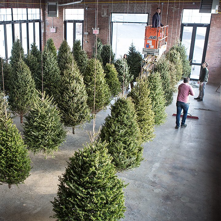 Suspended Forest is an interesting art exhibit that features dozens of discarded Christmas trees hung from the rafters of the Knockdown Center to create a surreal "forest" of dead, decaying trees.