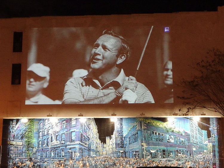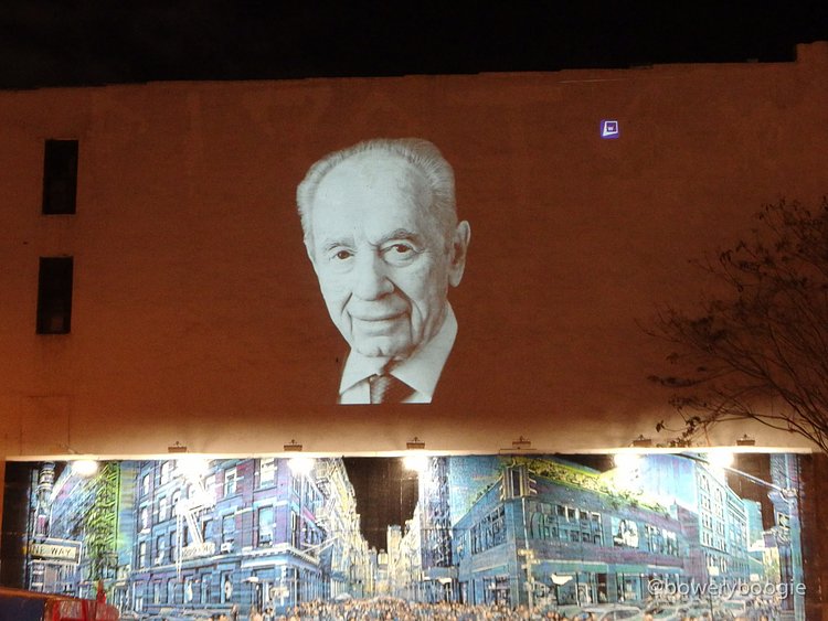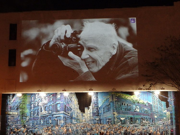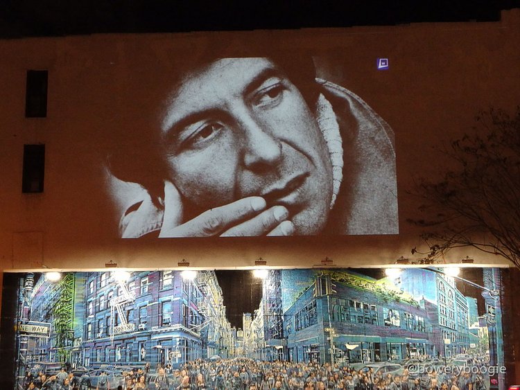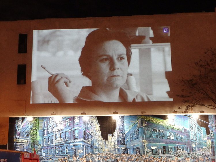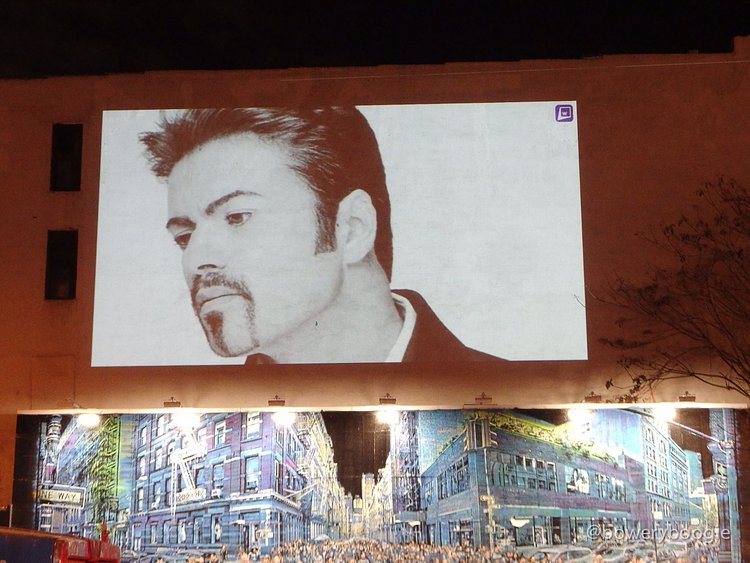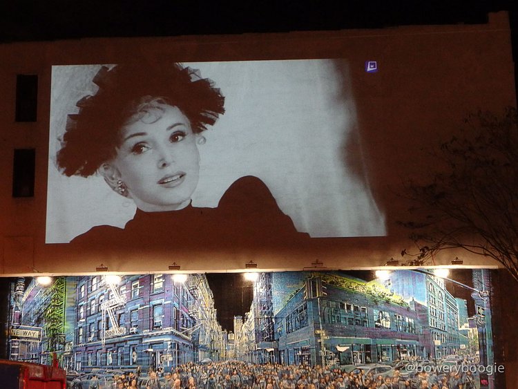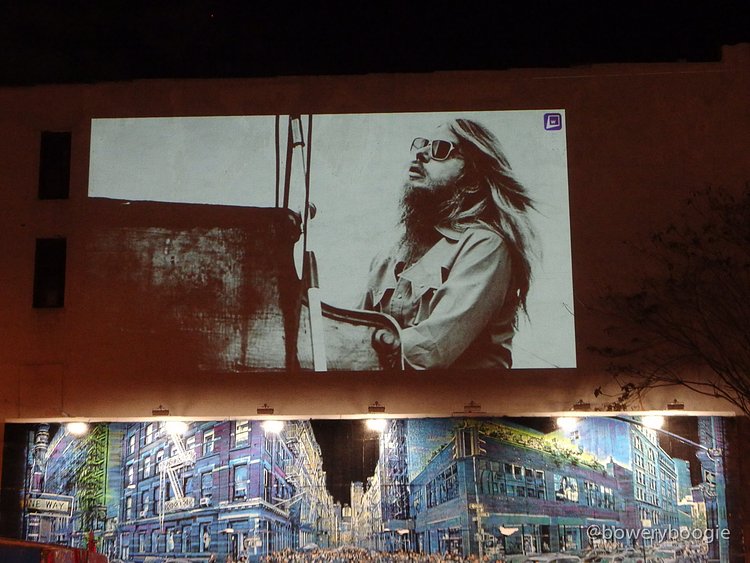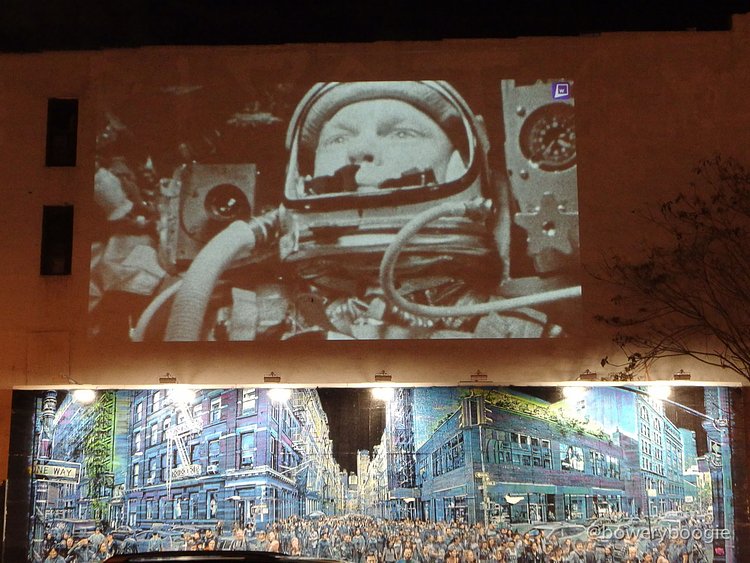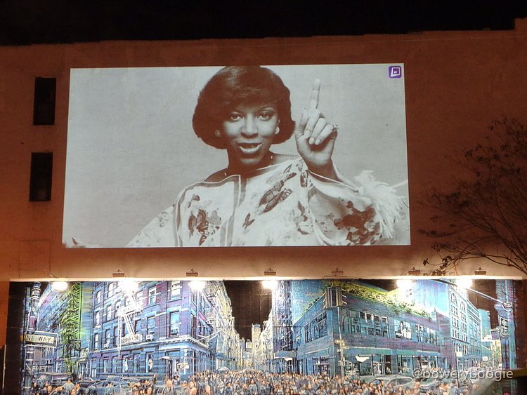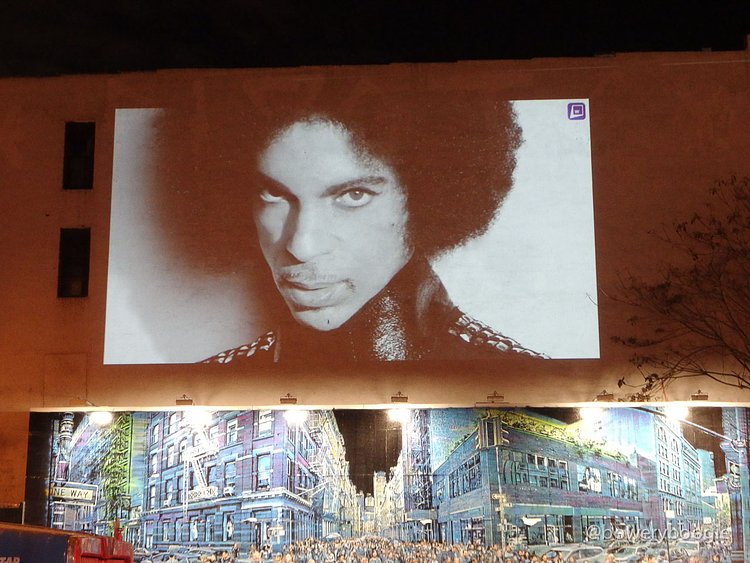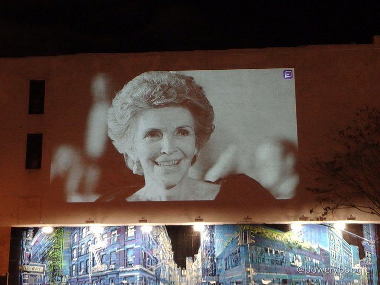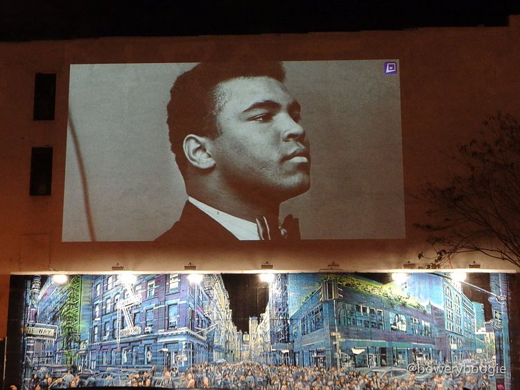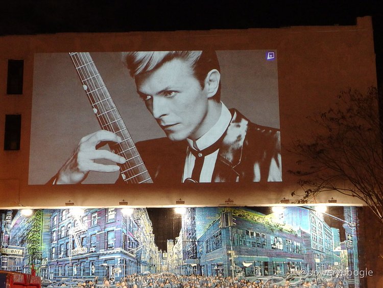 2016 has been a rough year for celebrity, musician, actor and artist deaths. The most recent Bowery Graffiti Wall installation sits actually atop the wall, and is a simple slideshow projection, an "in memoriam" which pays homage to those icons lost this year. Our friends at Bowery Boogie were one of the first to spot it: