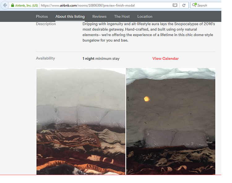 A enterprising Greenpoint man used the record snow this weekend to his advantage, constructing a "Boutique Winter Igloo for 2" and listing it on Airbnb for $200 a night. The listing has since been removed.