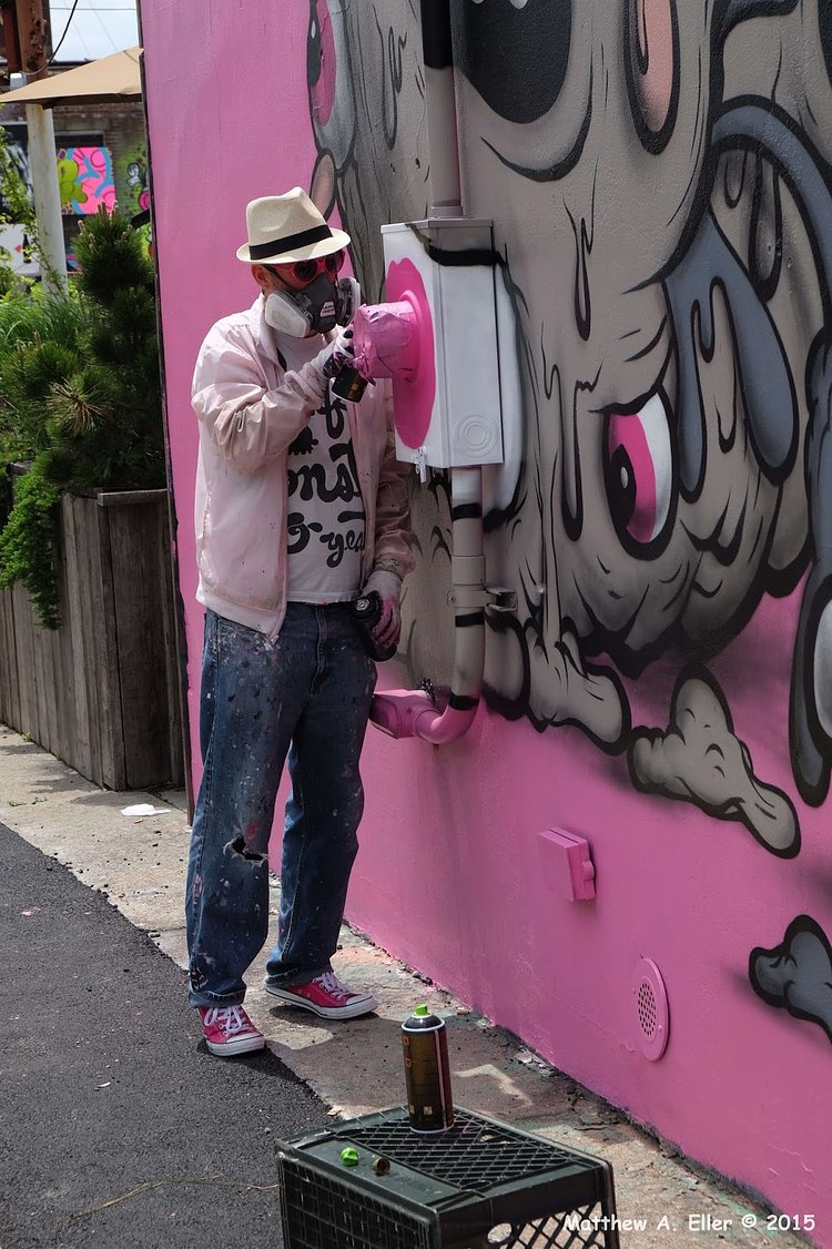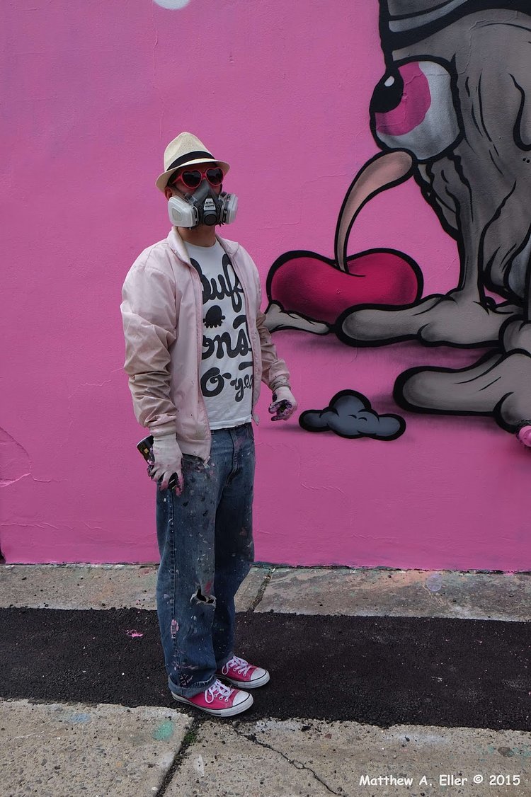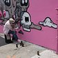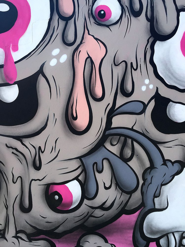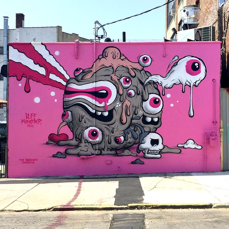 Our favorite power-pink street artist Buff Monster is back in Brooklyn with a new piece up at The Bushwick Collective featuring a giant eye meatball thingy on his signature pink background.