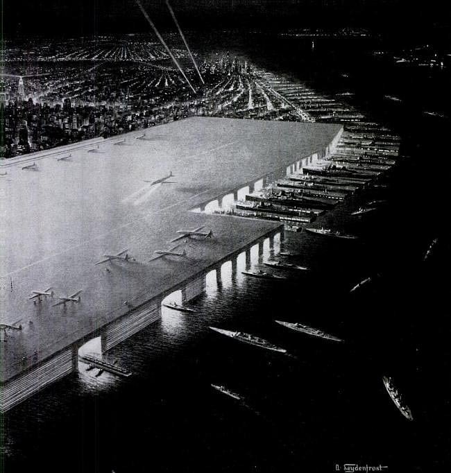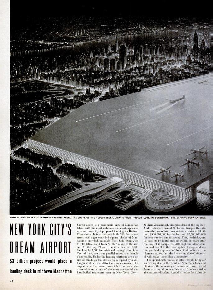 The 990-acre Manhattan Airport was the brainchild of real-estate mogul William Zeckendorf, who also owned the Chrysler Building and Astor Hotel. […] Zeckendorf's $3 billion project – an astronomical sum today, let alone in the 1940’s – would have stretched 144 blocks from 24th to 71st Streets and 9th Ave to the Hudson River at 200 feet above street level. The building below would have contained restaurants, business, waiting rooms and ticket offices, much like Port Authority or Penn Station do today.