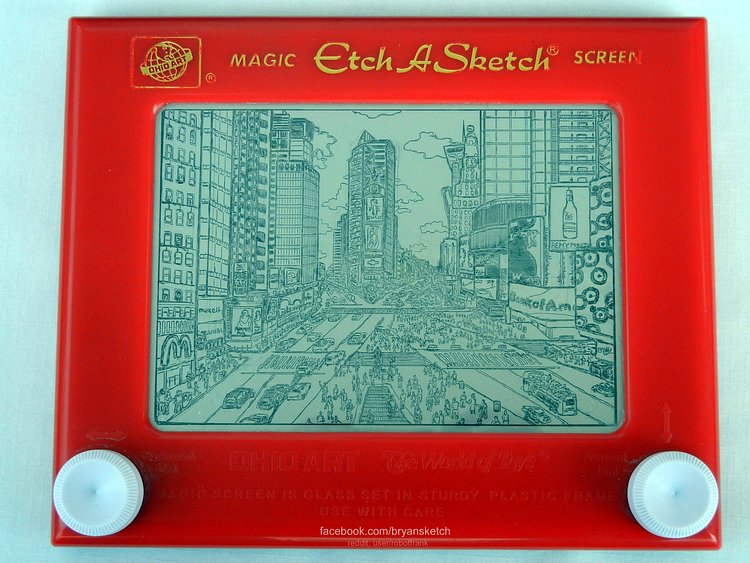 Etch A Sketch artist Bryan Lee Madden is perhaps one of the most patient people on this planet, spending about 50 hours creating an incredibly detailed illustrated sketch of Times Square. If you are unfamiliar with how this children's toy works, you rotate the knobs to create lines using a stylus under the screen, but you cannot lift the stylus at all, so the entire image is created using just continuous 1-line. Check out Madden's portfolio for more of his work.
