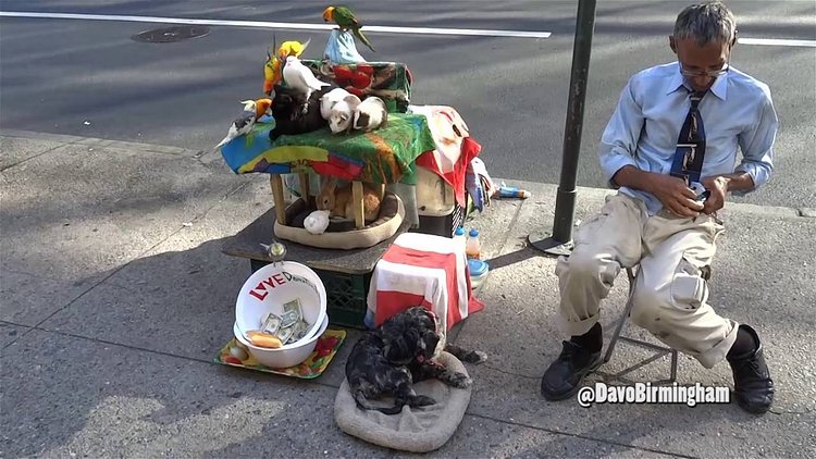 YouTuber DavoBirmingham2 recently uploaded this short video showing a New York City busker on 5th Avenue who setup a live animal farm complete with: