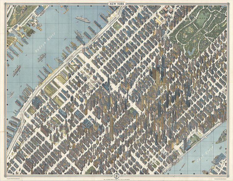 One of the greatest cartographic feats of all time, this 1963 axonometric ('bird's eye view') map of New York City was the first such since 1866. The technique dates back to the 15th century, and developed in Germany into a fully flowered cartographic art form called Vogelschaukarten in Germany in the 1800s. This particular map was prepared by Herman Bollmann for the 1964 New York World's Fair, where it was sold at information and tourist kiosks.