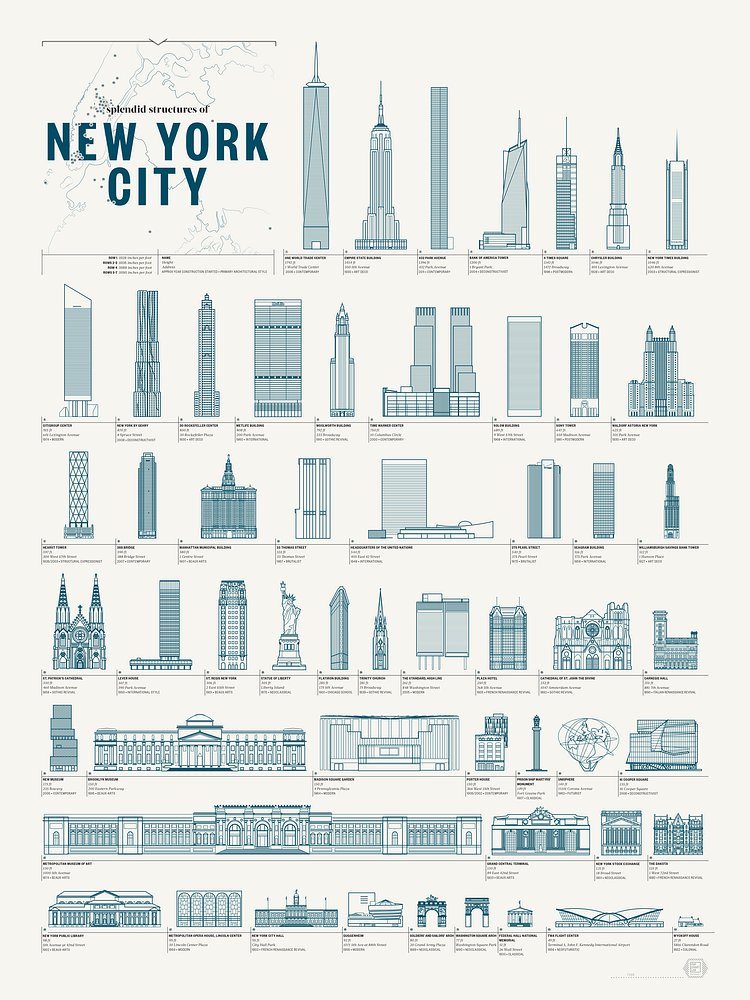 Pop Chart Lab is now selling prints of this amazing schematic design featuring dozens of New York City's most famous architectural landmarks. They are presented in a blueprint-style schematic design along with key stats on the structures such as height, location and year built.