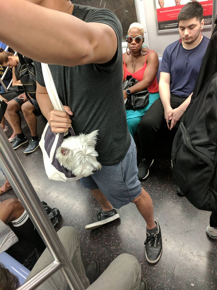 Today, September 22nd, is the last day of summer :( To help you cope with the inevitable cold that is just around the corner, here's a photo of a cute dog riding the subway in a small tote bag, following all the rules.