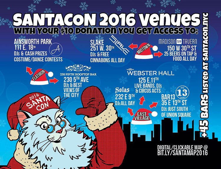 Though the full Santacon bar list has yet to be announced, here's a few of the main spots that they have released, giving you a clear picture of which parts of the City to avoid if you can. Basically, you will want to avoid the neighborhoods of NoMad, Flatiron, Gramercy, Union Square, and the East Village. Any Santa's with all-day drinking endurance might make it down to the LES, though that seems improbable as most end up like this by 5pm.