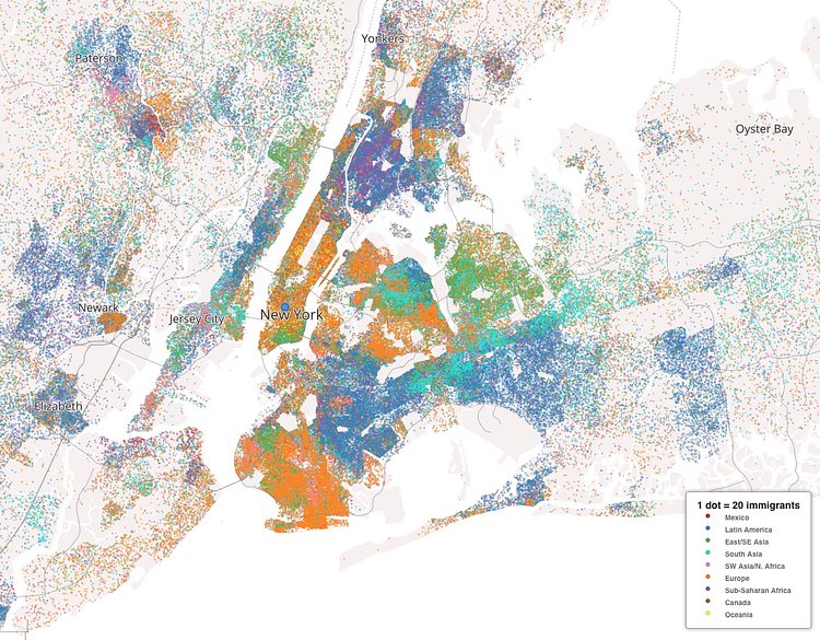 Using census tract data, Walker represents the concentration of America’s immigrant population as dots, colored according to their country of origin […] What results is a unique mix of colors—an immigrant fingerprint of each city, showing where its immigrant residents are from and where they currently live.