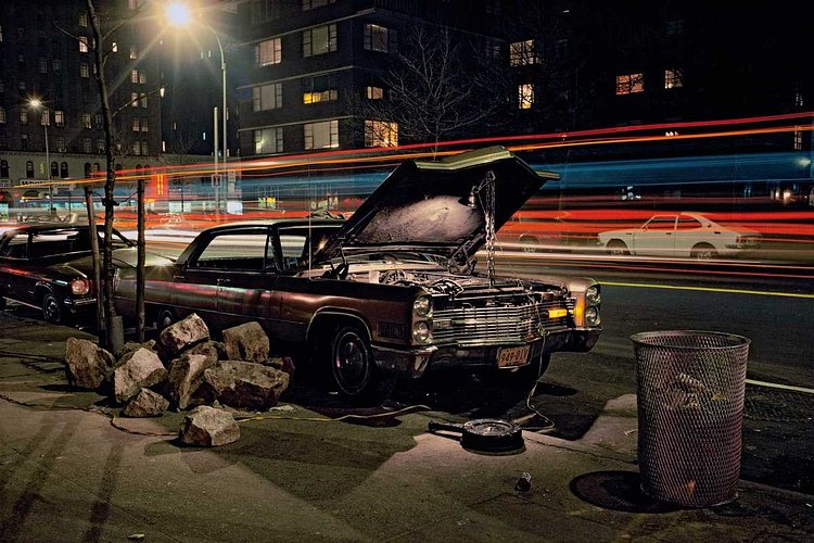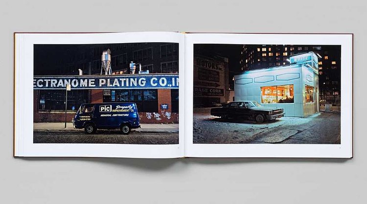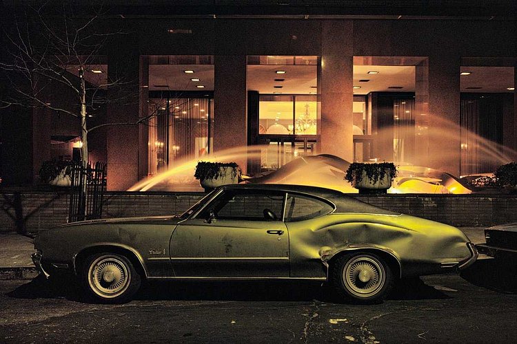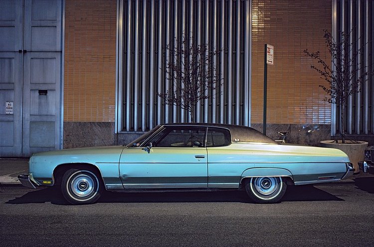 Shot in Kodachrome with a Leica and deftly lit with then-new sodium vapor lights, the pictures feature a distinct array of makes and models set against the gritty details of their surrounding urban and architectural environments, and occasionally the ghostly presence of people. “I experienced a conversion of sorts in making a switch from the ‘decisive moment’ of black and white to the marvel of color, a world I was waking up to every day,” Clay writes of this work. “At the time it seemed like an obvious and natural transition. What was less obvious was how to reflect my world of New York City in color … I discovered that night was its own color and I fell for it.”