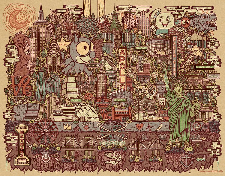 My goal was to capture the essence of New York in a fun abstract illustration. The illustration consists of the buildings, pop culture and history of New York from the past, present and future.