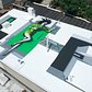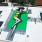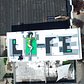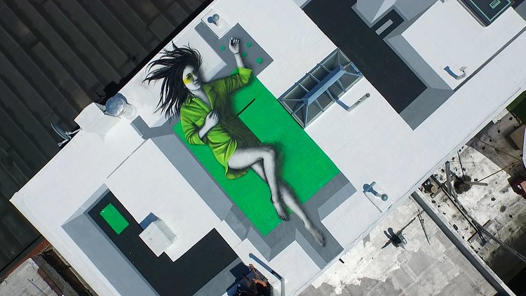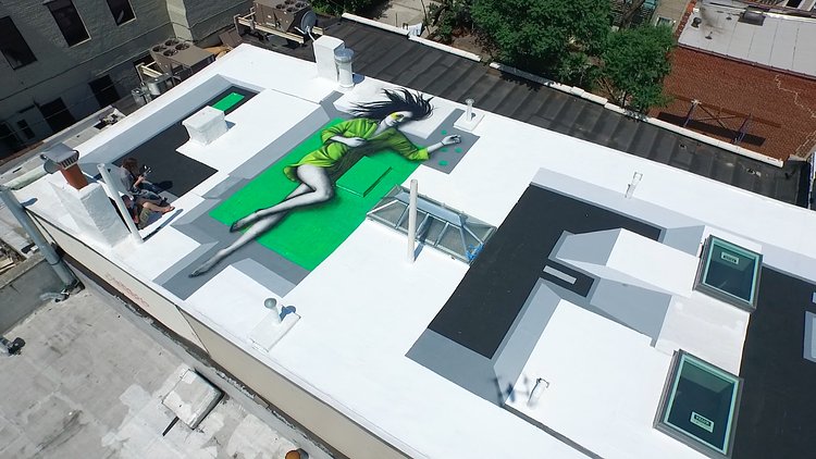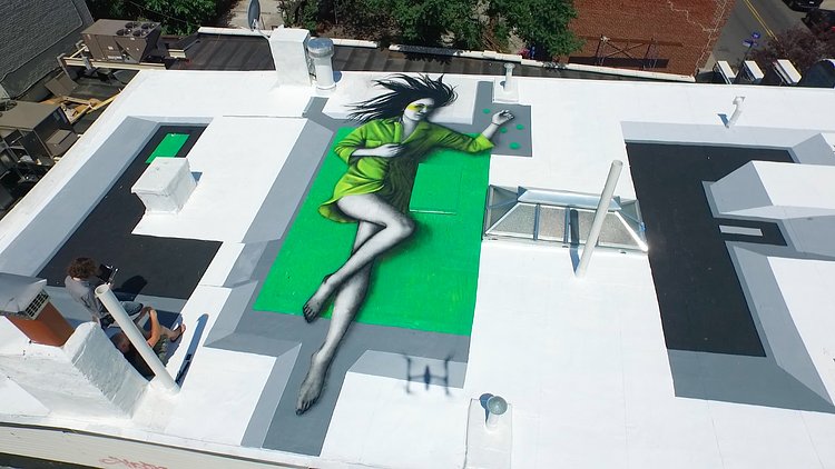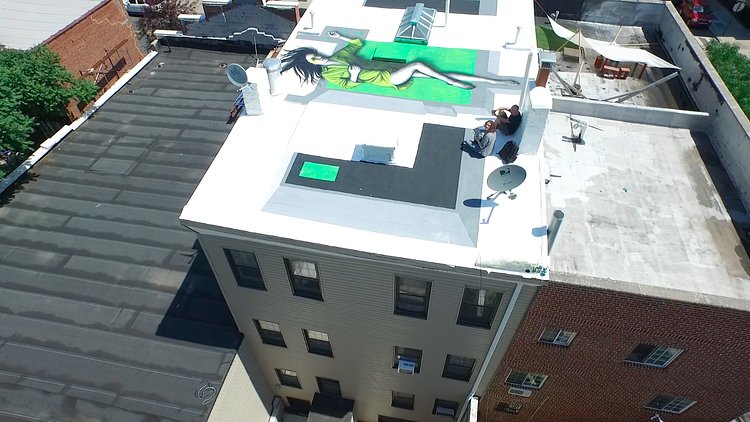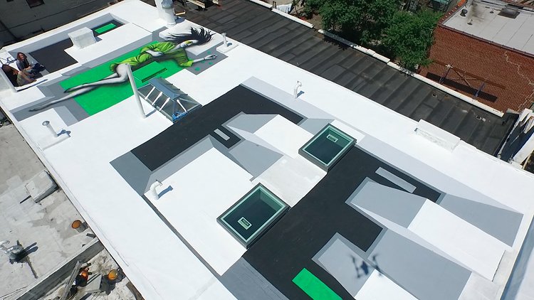 British street artists Fin DAC and Dean Zeus Colman recently spent 5 days working on an amazing mural on an unknown Bushwick rooftop, featuring a woman sprawled out across the building on a green patch of grass, while painted equipment and machinery combine shadows to spell out "Life".