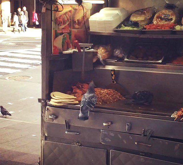 The owner was nowhere to be found! The pigeons were eating on the cart for a solid 10 minutes. There were two pigeons, one was standing on the grill eating the food and the other was just perched on the side.