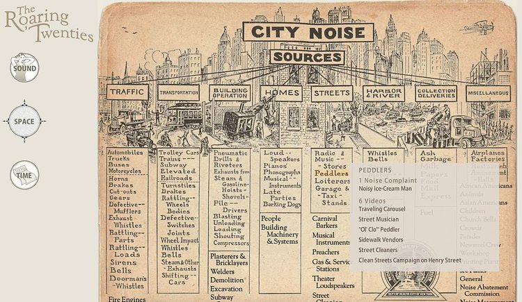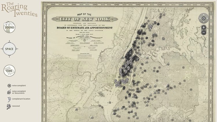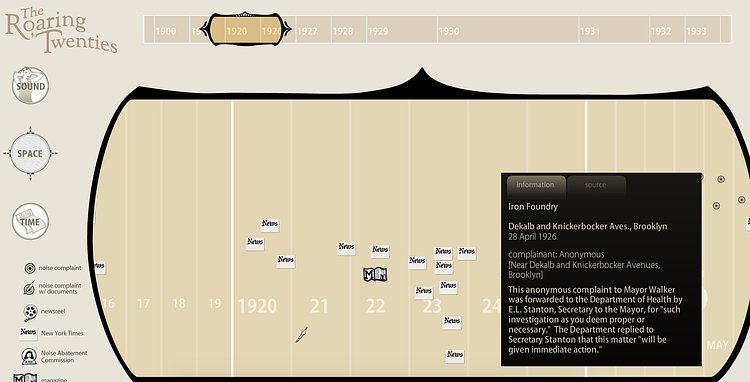 The Roaring Twenties is an interesting interactive audio/visual website which display all of the vintage noise complaints in New York City nearly a century ago. These complaints are linked with vintage audo and video recordings of similar elements, allowing you to immerse yourself into 1920s New York City thorough its noise complaints.