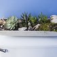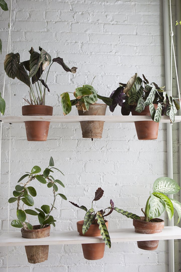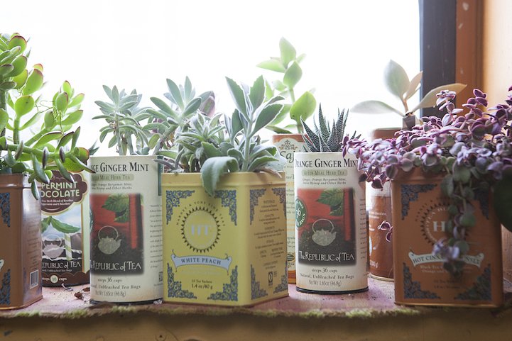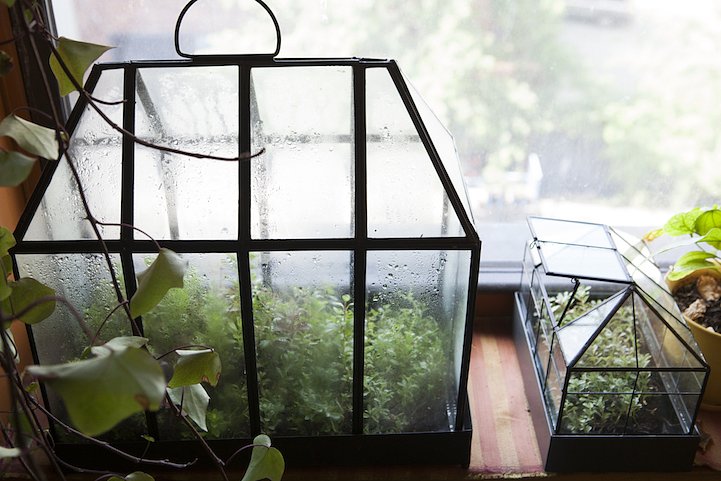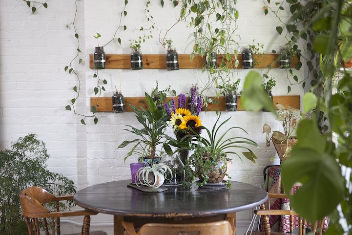 Oakes has resided in the home (which was previously an industrial building) for 11 years now, and she’s found endless inventive ways to turn it to a haven for flourishing flora. She installed a living wall in the bedroom with a sub-irrigation system connected to the sink to nourish the plants from below; she hung mason jars and pots from planks and plywood on the walls; and she propped miniature greenhouses in her window sills for the things that require more warmth and light. Even the bathroom has become a cozy residence for a diverse tray of succulents, roosting on top of the toilet.