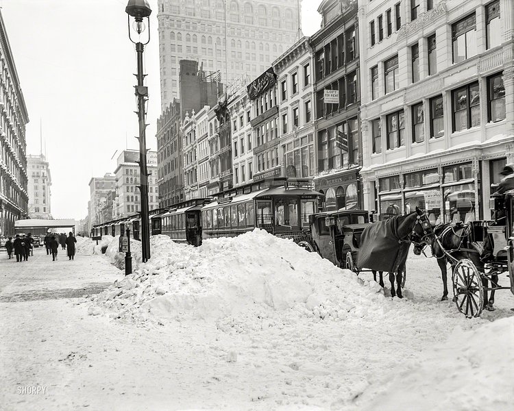 In this vintage photograph from 1905, just 3 years after its opening, we are looking East down 23rd Street towards a towering Flatiron Building, with a snow covered street with horse drawn carriages and trollies lined up on the side. For comparison, here is a Google Streetview of the same shot 115 years later: