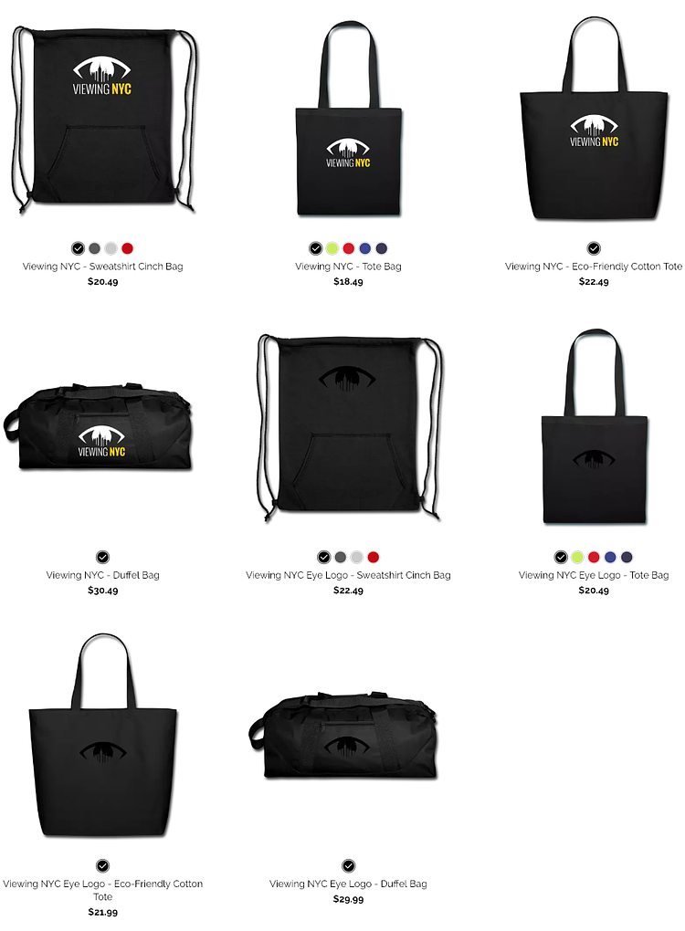 We may be biased, but we think the Viewing NYC logo is pretty cool. If you agree, check out hundreds of fully customizable items from the Viewing NYC online shop such as t-shirts, tote-bags, mugs, phone cases, and more. We offer items with the full logo and site name, or just items with the "eye" logo. You can even change the color or positioning of the logo on the items! Check them out!