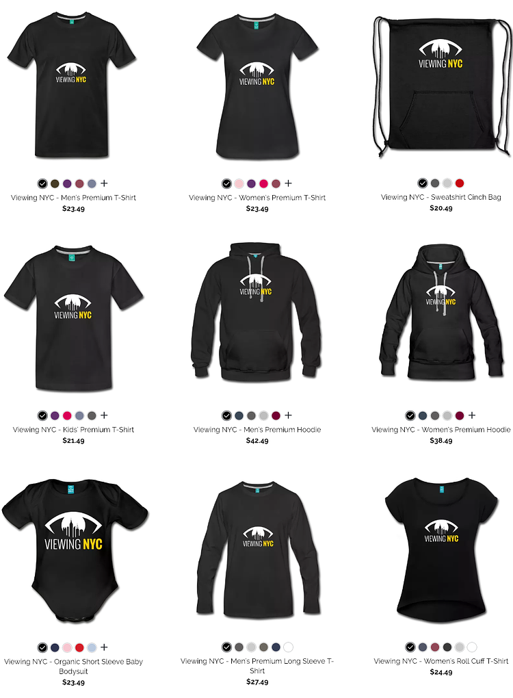 We may be biased, but we think the Viewing NYC logo is pretty cool. If you agree, check out hundreds of fully customizable items from the Viewing NYC online shop such as t-shirts, tote-bags, mugs, phone cases, and more. We offer items with the full logo and site name, or just items with the "eye" logo. You can even change the color or positioning of the logo on the items! Check them out!