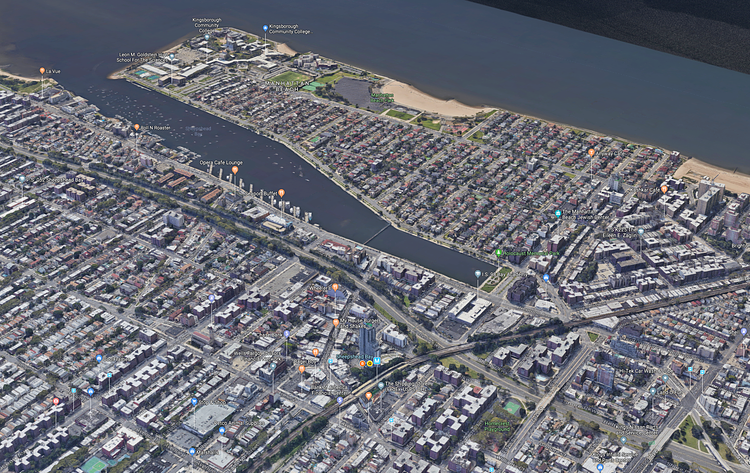 This vintage aerial photograph from the early 1930s shows the Sheepshead Bay neighborhood in Brooklyn before the addition of Robert Moses' Belt Parkway cut-off the neighborhood's access to and views of the bay. Here is a present-day view from approximately the same angle: