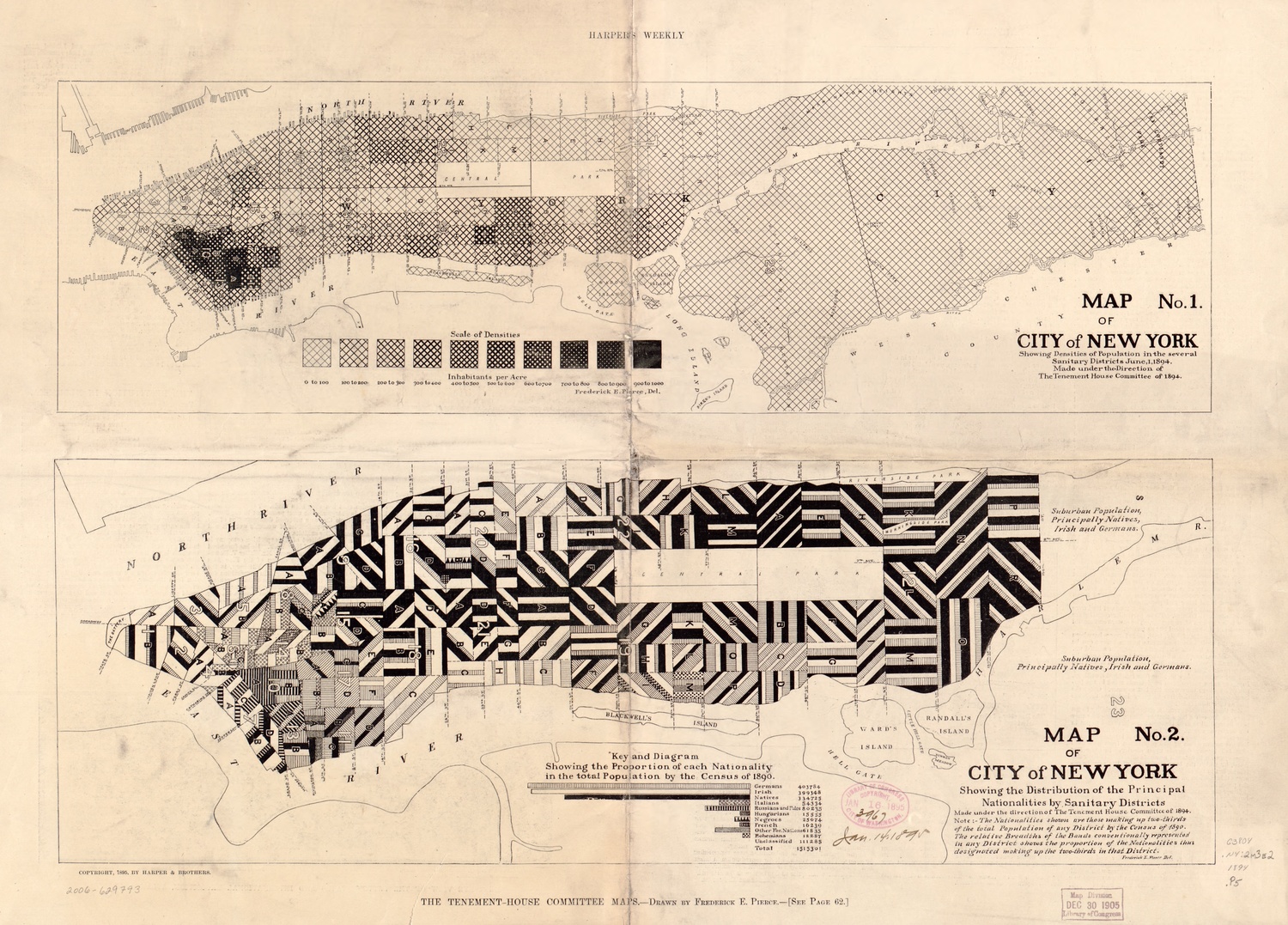 These two maps don’t represent the total diversity in any given sanitation district. They only show the largest two or three groups that made up two-thirds of each district’s population. The decision ultimately dramatized the strong presence of foreign-born citizens from Germany, Ireland, Italy, and Russia throughout Manhattan. Pierce told Harpers’ Weekly at the time that Scotch, English, Welsh, Scandinavian, and Canadian New Yorkers were not recorded due to “being in small numbers and perhaps less foreign than the others.”
