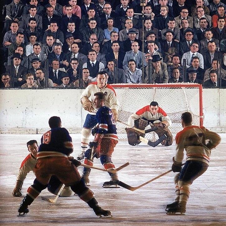 The 1957-1958 New York Rangers finished the season with a record of 32-25-13 for 77 points, leaving them with the second best record in the NHL. In this great vintage photograph from that year, see the Rangers take on the Montreal Canadiens at home, in the dangerous pre-helmet era.