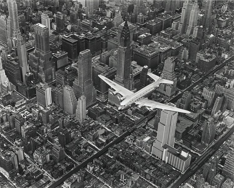 Photographer Margaret Bourke-White, former associate editor and staff photographer of Fortune magazine, snapped this amazing shot of a Douglass DC-4 airplane from above as it flew over Midtown. For comparison, here is a Google Map view of how it looks today.