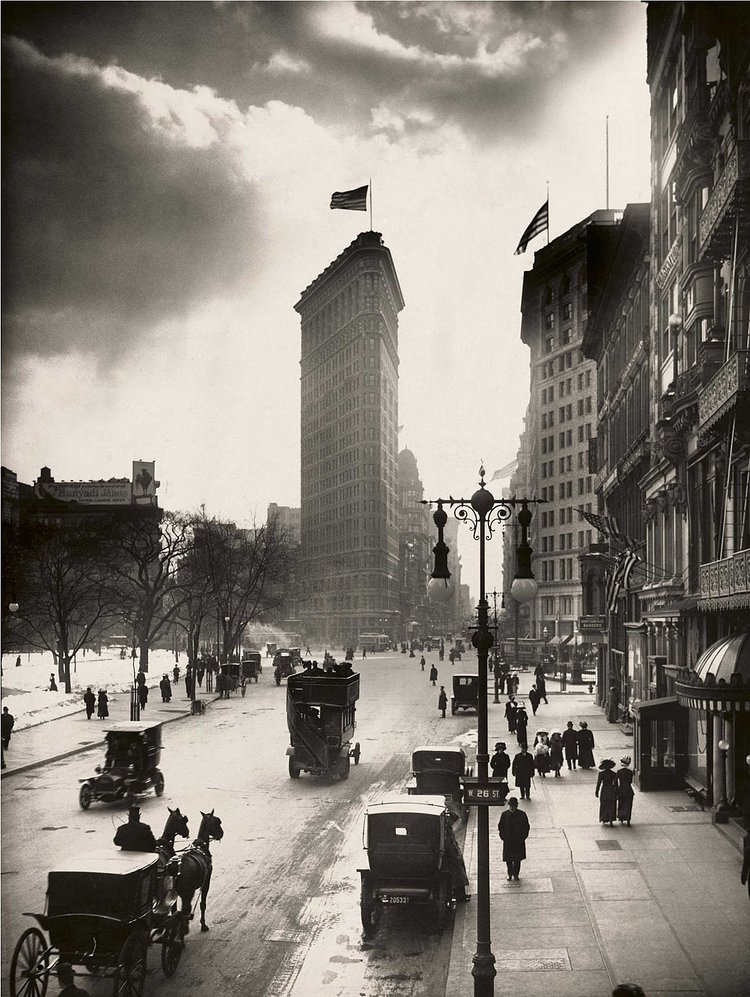 In this vintage photograph from 1916, we are looking South down 5th Avenue towards a lonesome Flatiron Building with Madison Square Park on our left and horse drawn carriages as far as the eye can see. For comparison, here is a Google Streetview of how it looks nearly 100 years later.