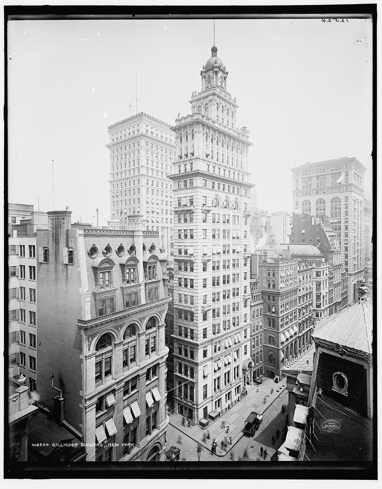 The Gillender Building was built in 1897 on the NW corner of Wall Street and Nassau Street. The 20-story building was one of the tallest buildings in the City, and its elegant exterior was a "wonder of the City."