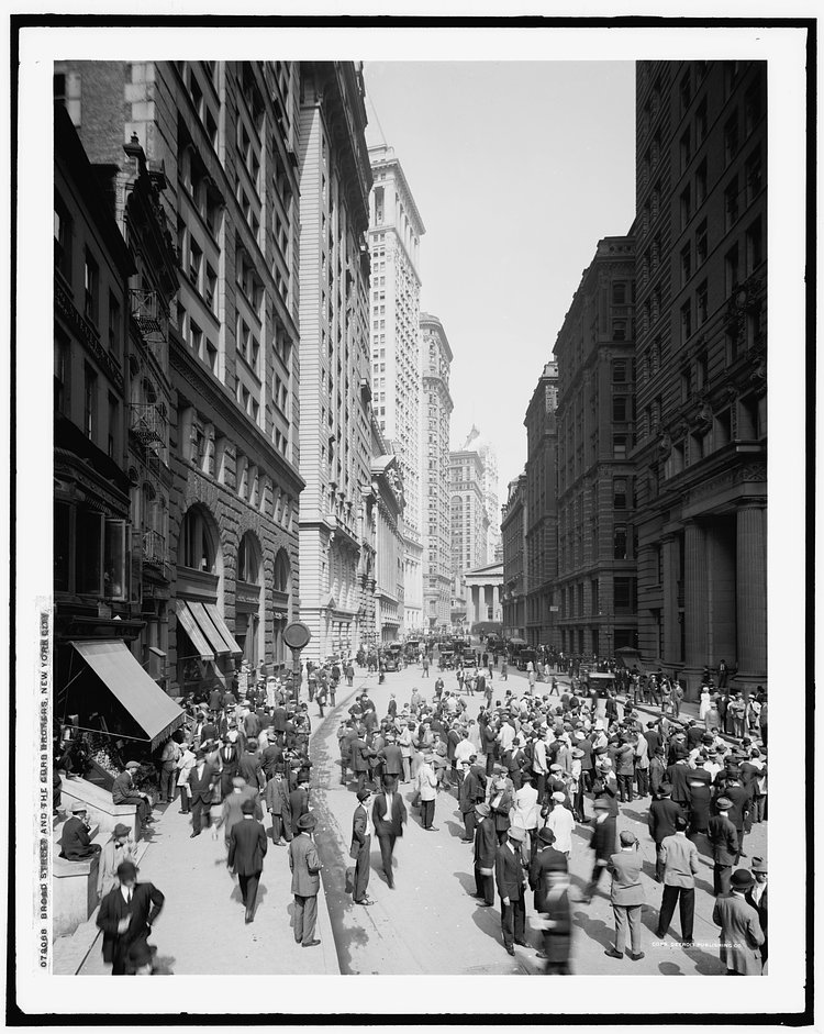 This fantastic vintage photograph from around 1915 shows Broad Street looking North towards Wall Street, and the many curb brokers that traded throughout the day.