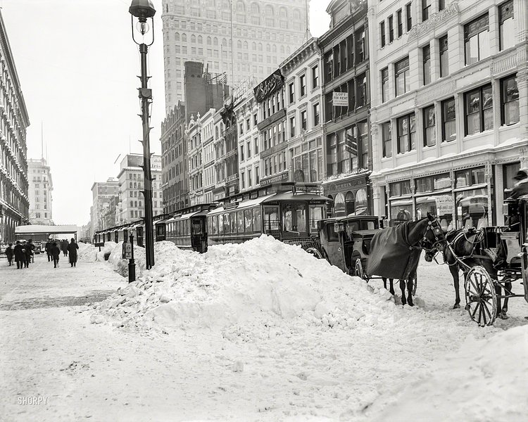 In this vintage photograph from 1905, just 3 years after its opening, we are looking East down 23rd Street towards a towering Flatiron Building, with a snow covered street with horse drawn carriages and trollies lined up on the side. For comparison, here is a Google Streetview of the same shot 111 years later.