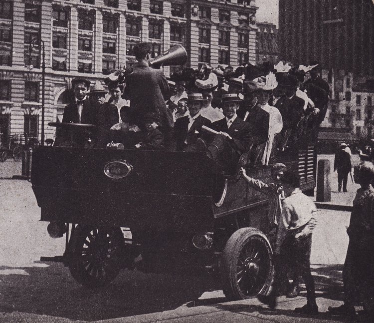 This photo is from around 1906 shows a group of tourists at Bowling Green, near the Battery. They are packed side by side in an early version of a motorized open omnibus or truck. A driver sits on the right behind a huge steering wheel while the tour guide with megaphone stands facing the tourists.