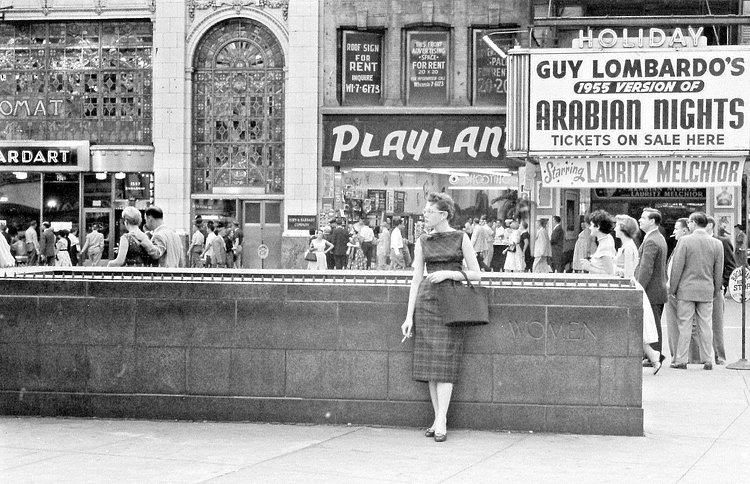 This great black and white vintage photograph from 1955 shows a busy Times Square filled with tourists and theater goers, along with a lone woman smoking a cigarette in the foreground. The buildings in the back are along the west side of 7th Avenue between 46th and 47th Streets. Here is a Google StreetView of how that same block looks today, completely different.