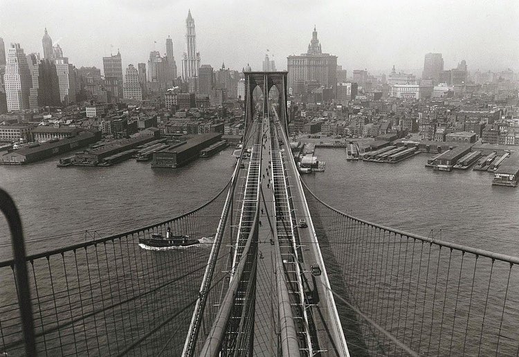 Captured by the famous photographer Eugene de Salignac on April 24th, 1933, this incredible vintage photograph shows the view of lower Manhattan from the top of one of the Brooklyn Bridge's towers. Below you see a few cars and pedestrians crossing the bridge, some docks and waterfront warehouses, and a small ship heading down the East River.