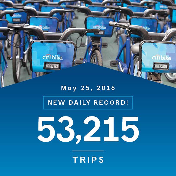 Yesterday New York had its first summer weather day and Citi Bike riders hit a new daily record - 53,215 trips! Way to go!