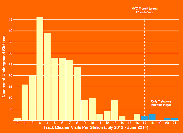 The MTA's goal is to clean the tracks in underground stations every three weeks with cleaning crews. But a city comptroller's report found that most stations did not meet that goal over the 12 months ending in June 2014. Some stations got cleaned just once.